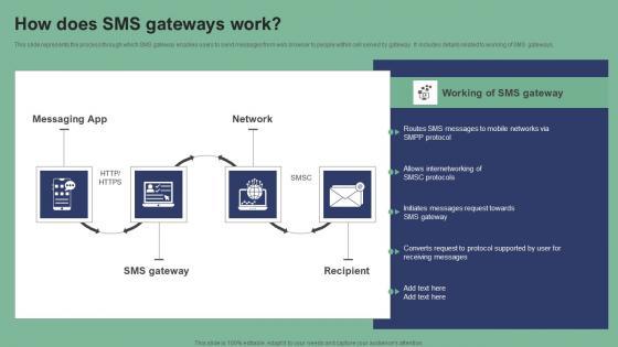 This slide represents the process through which SMS gateway enables users to send messages from web browser to people within cell served by gateway. It includes details related to working of SMS gateways. If you are looking for a format to display your unique thoughts, then the professionally designed How Does SMS Gateways Work Text Message Marketing Strategies Pictures Pdf is the one for you. You can use it as a Google Slides template or a PowerPoint template. Incorporate impressive visuals, symbols, images, and other charts. Modify or reorganize the text boxes as you desire. Experiment with shade schemes and font pairings. Alter, share or cooperate with other people on your work. Download How Does SMS Gateways Work Text Message Marketing Strategies Pictures Pdf and find out how to give a successful presentation. Present a perfect display to your team and make your presentation unforgettable. This slide represents the process through which SMS gateway enables users to send messages from web browser to people within cell served by gateway. It includes details related to working of SMS gateways.