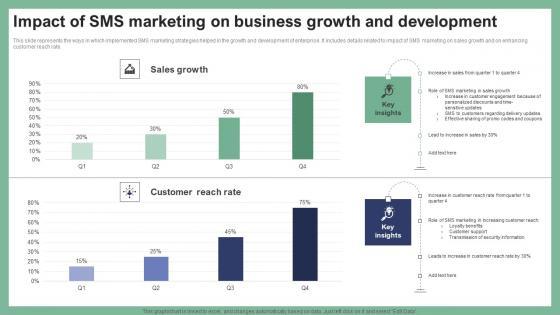 This slide represents the ways in which implemented SMS marketing strategies helped in the growth and development of enterprise. It includes details related to impact of SMS marketing on sales growth and on enhancing customer reach rate. Crafting an eye-catching presentation has never been more straightforward. Let your presentation shine with this tasteful yet straightforward Impact Of SMS Marketing On Business Growth Text Message Marketing Strategies Slides Pdf template. It offers a minimalistic and classy look that is great for making a statement. The colors have been employed intelligently to add a bit of playfulness while still remaining professional. Construct the ideal Impact Of SMS Marketing On Business Growth Text Message Marketing Strategies Slides Pdf that effortlessly grabs the attention of your audience. Begin now and be certain to wow your customers. This slide represents the ways in which implemented SMS marketing strategies helped in the growth and development of enterprise. It includes details related to impact of SMS marketing on sales growth and on enhancing customer reach rate.