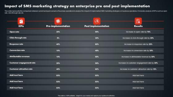 This slide represents the comparison between current and past scenario of business operations to analyze the impact of implemented SMS marketing strategies on business operations. It includes analysis of KPIs such as open rate, click-through rate etc. Are you searching for a Impact Of SMS Marketing Strategy On Enterprise Pre And Post Implementation Icons PDF that is uncluttered, straightforward, and original. Its easy to edit, and you can change the colors to suit your personal or business branding. For a presentation that expresses how much effort youve put in, this template is ideal. With all of its features, including tables, diagrams, statistics, and lists, its perfect for a business plan presentation. Make your ideas more appealing with these professional slides. Download Impact Of SMS Marketing Strategy On Enterprise Pre And Post Implementation Icons PDF from Slidegeeks today.