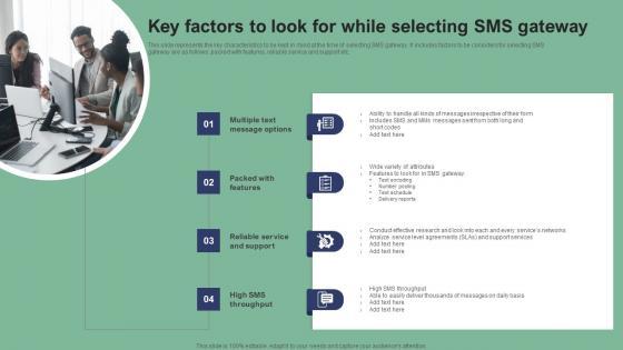 This slide represents the key characteristics to be kept in mind at the time of selecting SMS gateway. It includes factors to be considers for selecting SMS gateway are as follows packed with features, reliable service and support etc. The best PPT templates are a great way to save time, energy, and resources. Slidegeeks have 100 percent editable powerpoint slides making them incredibly versatile. With these quality presentation templates, you can create a captivating and memorable presentation by combining visually appealing slides and effectively communicating your message. Download Key Factors To Look For While Selecting SMS Text Message Marketing Strategies Information Pdf from Slidegeeks and deliver a wonderful presentation. This slide represents the key characteristics to be kept in mind at the time of selecting SMS gateway. It includes factors to be considers for selecting SMS gateway are as follows packed with features, reliable service and support etc.