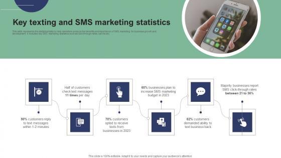 This slide represents the statistical data to help marketers analyze the benefits and importance of SMS marketing for business growth and development. It includes key SMS marketing statistics such as click through rates, opt-ins etc. Are you searching for a Key Texting And SMS Marketing Statistics Text Message Marketing Strategies Diagrams Pdf that is uncluttered, straightforward, and original It is easy to edit, and you can change the colors to suit your personal or business branding. For a presentation that expresses how much effort you have put in, this template is ideal With all of its features, including tables, diagrams, statistics, and lists, it is perfect for a business plan presentation. Make your ideas more appealing with these professional slides. Download Key Texting And SMS Marketing Statistics Text Message Marketing Strategies Diagrams Pdf from Slidegeeks today. This slide represents the statistical data to help marketers analyze the benefits and importance of SMS marketing for business growth and development. It includes key SMS marketing statistics such as click through rates, opt-ins etc.