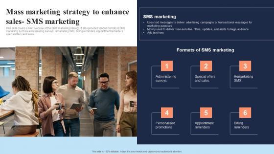 This slide covers a brief overview of the SMS marketing strategy. It also provides various formats of SMS marketing, such as administering surveys, remarketing SMS, billing reminders, appointment reminders, special offers, and sales. Coming up with a presentation necessitates that the majority of the effort goes into the content and the message you intend to convey. The visuals of a PowerPoint presentation can only be effective if it supplements and supports the story that is being told. Keeping this in mind our experts created Mass Marketing Strategy To Enhance Sales SMS Definitive Guide On Mass Advertising Elements Pdf to reduce the time that goes into designing the presentation. This way, you can concentrate on the message while our designers take care of providing you with the right template for the situation. This slide covers a brief overview of the SMS marketing strategy. It also provides various formats of SMS marketing, such as administering surveys, remarketing SMS, billing reminders, appointment reminders, special offers, and sales.