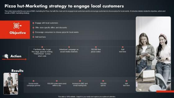 This slide represents the use case of SMS marketing for Pizza hut with the main aim to engage local customers and to encourage customers to choose pizza for local events. It includes details related to objective, action and results of SMS marketing strategy. Take your projects to the next level with our ultimate collection of Pizza Hut Marketing Strategy To Engage Local SMS Promotional Tactics Information PDF. Slidegeeks has designed a range of layouts that are perfect for representing task or activity duration, keeping track of all your deadlines at a glance. Tailor these designs to your exact needs and give them a truly corporate look with your own brand colors they will make your projects stand out from the rest This slide represents the use case of SMS marketing for Pizza hut with the main aim to engage local customers and to encourage customers to choose pizza for local events. It includes details related to objective, action and results of SMS marketing strategy.