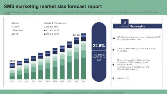 This slide represents the anticipated numbers to help business to predict future market characteristics and growth rate of SMS marketing in upcoming years. This slide represents the forecasted market size for SMS marketing by 2025. Do you have to make sure that everyone on your team knows about any specific topic I yes, then you should give SMS Marketing Market Size Forecast Report Text Message Marketing Strategies Summary Pdf a try. Our experts have put a lot of knowledge and effort into creating this impeccable SMS Marketing Market Size Forecast Report Text Message Marketing Strategies Summary Pdf. You can use this template for your upcoming presentations, as the slides are perfect to represent even the tiniest detail. You can download these templates from the Slidegeeks website and these are easy to edit. So grab these today. This slide represents the anticipated numbers to help business to predict future market characteristics and growth rate of SMS marketing in upcoming years. This slide represents the forecasted market size for SMS marketing by 2025.