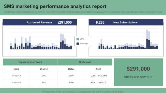 This slide represents the dashboard to track and monitor the overall performance of SMS marketing campaign and its impact on business sales and revenues. It includes details related to top automated flows, attributed revenue etc. From laying roadmaps to briefing everything in detail, our templates are perfect for you. You can set the stage with your presentation slides. All you have to do is download these easy-to-edit and customizable templates. SMS Marketing Performance Analytics Report Text Message Marketing Strategies Structure Pdf will help you deliver an outstanding performance that everyone would remember and praise you for. Do download this presentation today. This slide represents the dashboard to track and monitor the overall performance of SMS marketing campaign and its impact on business sales and revenues. It includes details related to top automated flows, attributed revenue etc.