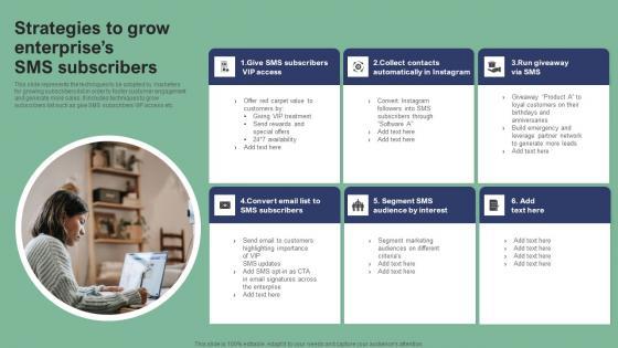 This slide represents the techniques to be adopted by marketers for growing subscribers list in order to foster customer engagement and generate more sales. It includes techniques to grow subscribers list such as give SMS subscribers VIP access etc. If your project calls for a presentation, then Slidegeeks is your go-to partner because we have professionally designed, easy-to-edit templates that are perfect for any presentation. After downloading, you can easily edit Strategies To Grow Enterprises SMS Subscribers Text Message Marketing Strategies Portrait Pdf and make the changes accordingly. You can rearrange slides or fill them with different images. Check out all the handy templates This slide represents the techniques to be adopted by marketers for growing subscribers list in order to foster customer engagement and generate more sales. It includes techniques to grow subscribers list such as give SMS subscribers VIP access etc.