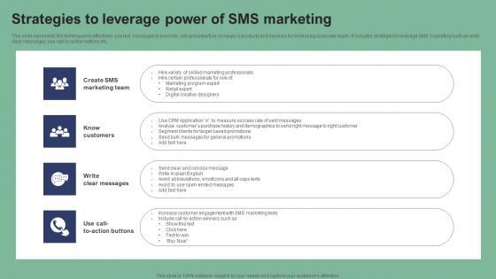 This slide represents the techniques to effectively use text messages to promote, sell and advertise companys products and services for increasing customer reach. It includes strategies to leverage SMS marketing such as write clear messages, use call-to-action buttons etc. Find a pre-designed and impeccable Strategies To Leverage Power Of SMS Marketing Text Message Marketing Strategies Information Pdf. The templates can ace your presentation without additional effort. You can download these easy-to-edit presentation templates to make your presentation stand out from others. So, what are you waiting for Download the template from Slidegeeks today and give a unique touch to your presentation. This slide represents the techniques to effectively use text messages to promote, sell and advertise companys products and services for increasing customer reach. It includes strategies to leverage SMS marketing such as write clear messages, use call-to-action buttons etc.