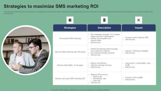 This slide represents the tactics to be followed by marketers to improve ROI for SMS marketing for making better future business decisions. It includes strategies for enhancing SMS marketing ROI such as personalized SMS marketing etc. Boost your pitch with our creative Strategies To Maximize SMS Marketing ROI Text Message Marketing Strategies Ideas Pdf. Deliver an awe-inspiring pitch that will mesmerize everyone. Using these presentation templates you will surely catch everyones attention. You can browse the ppts collection on our website. We have researchers who are experts at creating the right content for the templates. So you do not have to invest time in any additional work. Just grab the template now and use them. This slide represents the tactics to be followed by marketers to improve ROI for SMS marketing for making better future business decisions. It includes strategies for enhancing SMS marketing ROI such as personalized SMS marketing etc.