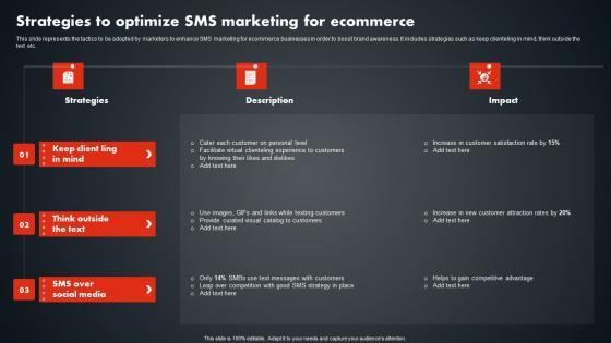This slide represents the tactics to be adopted by marketers to enhance SMS marketing for ecommerce businesses in order to boost brand awareness. It includes strategies such as keep clienteling in mind, think outside the text etc. Create an editable Strategies To Optimize SMS Marketing Text Message Marketing Strategies Introduction Pdf that communicates your idea and engages your audience. Whether you are presenting a business or an educational presentation, pre-designed presentation templates help save time. Strategies To Optimize SMS Marketing Text Message Marketing Strategies Introduction Pdf is highly customizable and very easy to edit, covering many different styles from creative to business presentations. Slidegeeks has creative team members who have crafted amazing templates. So, go and get them without any delay. This slide represents the tactics to be adopted by marketers to enhance SMS marketing for ecommerce businesses in order to boost brand awareness. It includes strategies such as keep clienteling in mind, think outside the text etc.