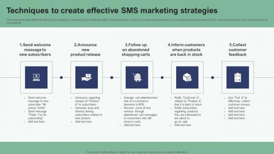 This slide represents different methods to be adopted by marketers to build effective SMS marketing tactics in order to increase brand awareness. It includes techniques to develop SMS marketing strategies such as send welcome message etc. Want to ace your presentation in front of a live audience Our Techniques To Create Effective SMS Marketing Strategies Text Message Marketing Strategies Clipart Pdf can help you do that by engaging all the users towards you. Slidegeeks experts have put their efforts and expertise into creating these impeccable powerpoint presentations so that you can communicate your ideas clearly. Moreover, all the templates are customizable, and easy-to-edit and downloadable. Use these for both personal and commercial use. This slide represents different methods to be adopted by marketers to build effective SMS marketing tactics in order to increase brand awareness. It includes techniques to develop SMS marketing strategies such as send welcome message etc.