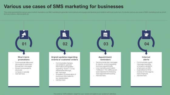 This slide represents the various ways in which marketers use SMS marketing to generate more revenue and engage and develop good relations with loyal customers. It includes various use cases of SMS marketing such as short-term promotions, internal alerts etc. Slidegeeks is one of the best resources for PowerPoint templates. You can download easily and regulate Various Use Cases Of SMS Marketing For Businesses Text Message Marketing Strategies Diagrams Pdf for your personal presentations from our wonderful collection. A few clicks is all it takes to discover and get the most relevant and appropriate templates. Use our Templates to add a unique zing and appeal to your presentation and meetings. All the slides are easy to edit and you can use them even for advertisement purposes. This slide represents the various ways in which marketers use SMS marketing to generate more revenue and engage and develop good relations with loyal customers. It includes various use cases of SMS marketing such as short-term promotions, internal alerts etc.