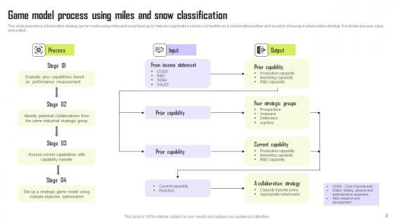This slide presents a collaborative strategy game model using miles and snow typology to help an organization select a competitor as a collaborative partner and assist in choosing a collaboration strategy. It includes process, input, and output. Pitch your topic with ease and precision using this Game Model Process Using Miles And Snow Classification Template Pdf This layout presents information on Process, Prior Capability, Current Capability, Strategic Groups It is also available for immediate download and adjustment. So, changes can be made in the color, design, graphics or any other component to create a unique layout. This slide presents a collaborative strategy game model using miles and snow typology to help an organization select a competitor as a collaborative partner and assist in choosing a collaboration strategy. It includes process, input, and output.