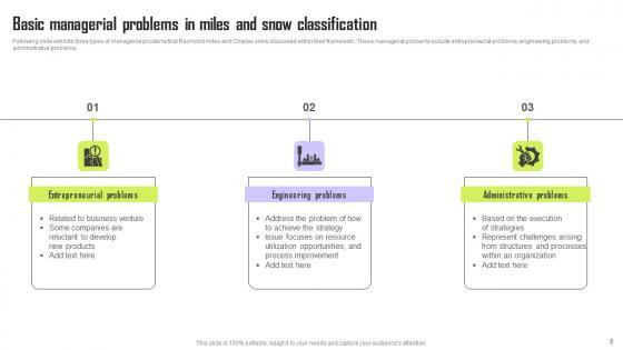 Following slide exhibits three types of managerial problems that Raymond miles and Charles snow discussed within their framework. These managerial problems include entrepreneurial problems, engineering problems, and administrative problems. Showcasing this set of slides titled Basic Managerial Problems In Miles And Snow Classification Rules Pdf The topics addressed in these templates are Entrepreneurial Problems, Engineering Problems, Administrative Problems All the content presented in this PPT design is completely editable. Download it and make adjustments in color, background, font etc. as per your unique business setting. Following slide exhibits three types of managerial problems that Raymond miles and Charles snow discussed within their framework. These managerial problems include entrepreneurial problems, engineering problems, and administrative problems.