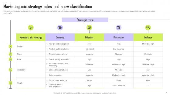 This slide highlights the usefulness of miles and snow typology to the field of marketing strategy used by firms in a dynamic environment. This includes marketing mix strategy such as product, place, price, promotion, and people. Showcasing this set of slides titled Marketing Mix Strategy Miles And Snow Classification Template Pdf The topics addressed in these templates are Marketing Mix Strategy, Strategic Type, Prospector All the content presented in this PPT design is completely editable. Download it and make adjustments in color, background, font etc. as per your unique business setting. This slide highlights the usefulness of miles and snow typology to the field of marketing strategy used by firms in a dynamic environment. This includes marketing mix strategy such as product, place, price, promotion, and people.