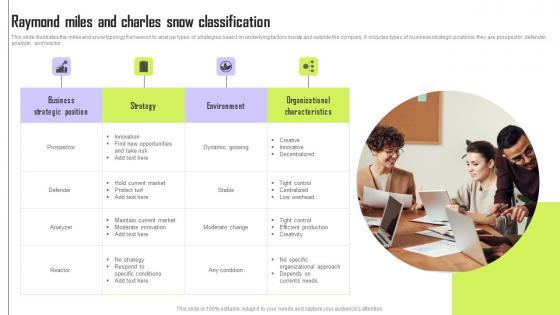 This slide illustrates the miles and snow typology framework to analyze types of strategies based on underlying factors inside and outside the company. It includes types of business strategic positions, they are prospector, defender, analyzer, and reactor. Showcasing this set of slides titled Raymond Miles And Charles Snow Classification Summary Pdf The topics addressed in these templates are Business Strategic Position, Organizational Characteristics All the content presented in this PPT design is completely editable. Download it and make adjustments in color, background, font etc. as per your unique business setting. This slide illustrates the miles and snow typology framework to analyze types of strategies based on underlying factors inside and outside the company. It includes types of business strategic positions, they are prospector, defender, analyzer, and reactor.