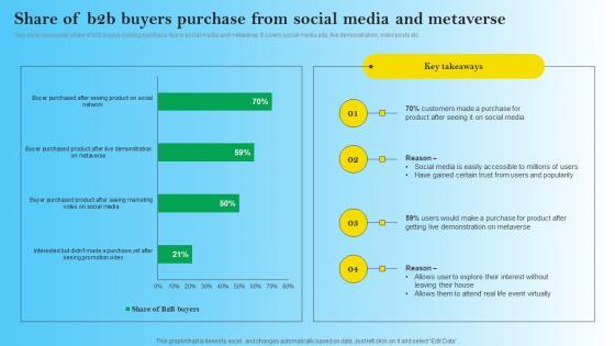 This slide represents share of b2b buyers making purchase due to social media and metaverse. It covers social media ads, live demonstration, video posts etc. Do you know about Slidesgeeks Share Of B2B Buyers Purchase From Social Media And Metaverse B2B Digital Commerce Microsoft Pdf These are perfect for delivering any kind od presentation. Using it, create PowerPoint presentations that communicate your ideas and engage audiences. Save time and effort by using our pre-designed presentation templates that are perfect for a wide range of topic. Our vast selection of designs covers a range of styles, from creative to business, and are all highly customizable and easy to edit. Download as a PowerPoint template or use them as Google Slides themes. This slide represents share of b2b buyers making purchase due to social media and metaverse. It covers social media ads, live demonstration, video posts etc.