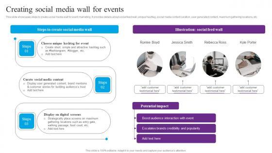 This slide showcases steps to create social media wall for event marketing. It provides details about social feed wall, unique hashtag, social media content curation, user generated content, maximum gathering locations, etc. The best PPT templates are a great way to save time, energy, and resources. Slidegeeks have 100 percent editable powerpoint slides making them incredibly versatile. With these quality presentation templates, you can create a captivating and memorable presentation by combining visually appealing slides and effectively communicating your message. Download Creating Social Media Wall Centric Marketing To Enhance Brand Connections Pictures Pdf from Slidegeeks and deliver a wonderful presentation. This slide showcases steps to create social media wall for event marketing. It provides details about social feed wall, unique hashtag, social media content curation, user generated content, maximum gathering locations, etc.