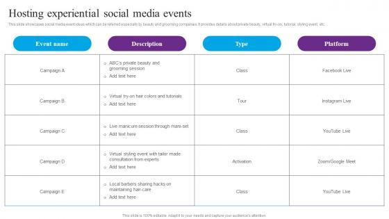 This slide showcases social media event ideas which can be referred especially by beauty and grooming companies. It provides details about private beauty, virtual try on, tutorial, styling event, etc. Create an editable Hosting Experiential Social Centric Marketing To Enhance Brand Connections Sample Pdf that communicates your idea and engages your audience. Whether you are presenting a business or an educational presentation, pre designed presentation templates help save time. Hosting Experiential Social Centric Marketing To Enhance Brand Connections Sample Pdf is highly customizable and very easy to edit, covering many different styles from creative to business presentations. Slidegeeks has creative team members who have crafted amazing templates. So, go and get them without any delay. This slide showcases social media event ideas which can be referred especially by beauty and grooming companies. It provides details about private beauty, virtual try on, tutorial, styling event, etc.