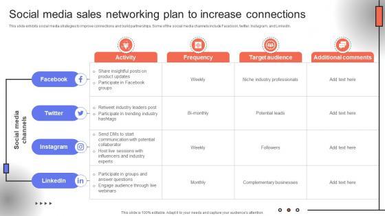 This slide exhibits social media strategies to improve connections and build partnerships. Some of the social media channels include Facebook, twitter, Instagram, and LinkedIn. Do you have an important presentation coming up Are you looking for something that will make your presentation stand out from the rest Look no further than Elevating Sales Networks Social Media Sales Networking Plan To Increase Connections SA SS V. With our professional designs, you can trust that your presentation will pop and make delivering it a smooth process. And with Slidegeeks, you can trust that your presentation will be unique and memorable. So why wait Grab Elevating Sales Networks Social Media Sales Networking Plan To Increase Connections SA SS V today and make your presentation stand out from the rest This slide exhibits social media strategies to improve connections and build partnerships. Some of the social media channels include Facebook, twitter, Instagram, and LinkedIn.