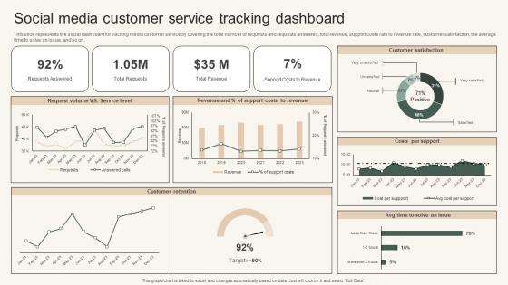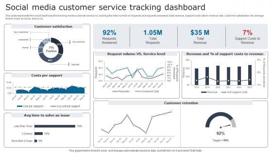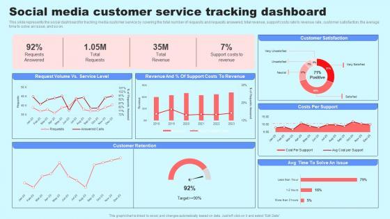 This slide represents the social dashboard for tracking media customer service by covering the total number of requests and requests answered, total revenue, support costs rate to revenue rate, customer satisfaction, the average time to solve an issue, and so on. If your project calls for a presentation, then Slidegeeks is your go to partner because we have professionally designed, easy to edit templates that are perfect for any presentation. After downloading, you can easily edit Social Media Customer Service Digital Signage In Internal Communication Channels Template Pdf and make the changes accordingly. You can rearrange slides or fill them with different images. Check out all the handy templates This slide represents the social dashboard for tracking media customer service by covering the total number of requests and requests answered, total revenue, support costs rate to revenue rate, customer satisfaction, the average time to solve an issue, and so on.