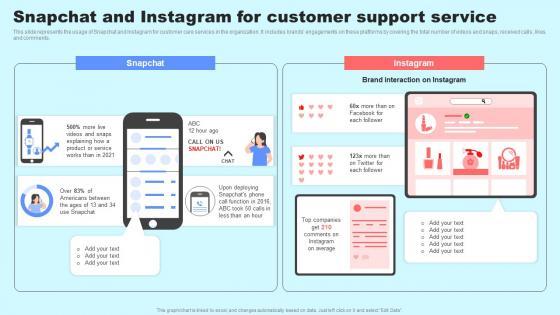 This slide represents the usage of Snapchat and Instagram for customer care services in the organization. It includes brands engagements on these platforms by covering the total number of videos and snaps, received calls, likes, and comments. Presenting this PowerPoint presentation, titled Social Media In Customer Support Snapchat And Instagram For Customer Support Service Summary Pdf, with topics curated by our researchers after extensive research. This editable presentation is available for immediate download and provides attractive features when used. Download now and captivate your audience. Presenting this Social Media In Customer Support Snapchat And Instagram For Customer Support Service Summary Pdf. Our researchers have carefully researched and created these slides with all aspects taken into consideration. This is a completely customizable Social Media In Customer Support Snapchat And Instagram For Customer Support Service Summary Pdf that is available for immediate downloading. Download now and make an impact on your audience. Highlight the attractive features available with our PPTs. This slide represents the usage of Snapchat and Instagram for customer care services in the organization. It includes brands engagements on these platforms by covering the total number of videos and snaps, received calls, likes, and comments.