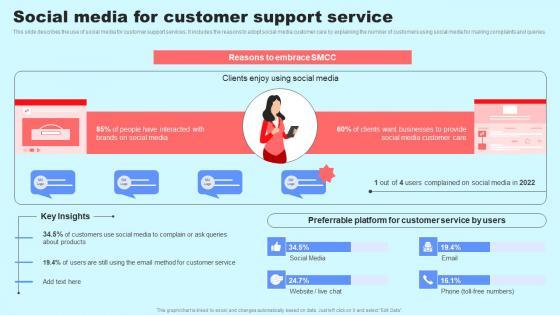 This slide describes the use of social media for customer support services. It includes the reasons to adopt social media customer care by explaining the number of customers using social media for making complaints and queries. Take your projects to the next level with our ultimate collection of Social Media In Customer Support Social Media For Customer Support Service Graphics Pdf. Slidegeeks has designed a range of layouts that are perfect for representing task or activity duration, keeping track of all your deadlines at a glance. Tailor these designs to your exact needs and give them a truly corporate look with your own brand colors they will make your projects stand out from the rest This slide describes the use of social media for customer support services. It includes the reasons to adopt social media customer care by explaining the number of customers using social media for making complaints and queries.
