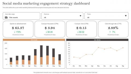 This slide outlines the social media marketing dashboard to track progress towards goals and make data driven decisions. Showcasing this set of slides titled Social Media Marketing Engagement Strategy Dashboard Ppt Professional Sample Pdf. The topics addressed in these templates are Cost Per Thousand, Cost Per Click, Spend On Advertisement. All the content presented in this PPT design is completely editable. Download it and make adjustments in color, background, font etc. as per your unique business setting. This slide outlines the social media marketing dashboard to track progress towards goals and make data driven decisions.