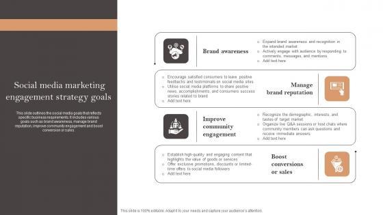 This slide outlines the social media goals that reflects specific business requirements. It includes various goals such as brand awareness, manage brand reputation, improve community engagement and boost conversion or sales. Pitch your topic with ease and precision using this Social Media Marketing Engagement Strategy Goals Ppt Ideas Deck Pdf. This layout presents information on Manage Brand Reputation, Improve Community Engagement, Boost Conversion. It is also available for immediate download and adjustment. So, changes can be made in the color, design, graphics or any other component to create a unique layout. This slide outlines the social media goals that reflects specific business requirements. It includes various goals such as brand awareness, manage brand reputation, improve community engagement and boost conversion or sales.