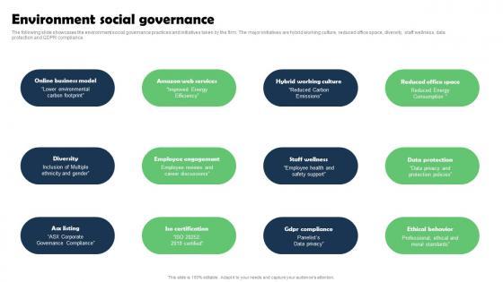 The following slide showcases the environment social governance practices and initiatives taken by the firm. The major initiatives are hybrid working culture, reduced office space, diversity, staff wellness, data protection and GDPR compliance Find highly impressive Data Driven Marketing Solutions Firm Company Profile Environment Social Governance Mockup PDF on Slidegeeks to deliver a meaningful presentation. You can save an ample amount of time using these presentation templates. No need to worry to prepare everything from scratch because Slidegeeks experts have already done a huge research and work for you. You need to download Data Driven Marketing Solutions Firm Company Profile Environment Social Governance Mockup PDF for your upcoming presentation. All the presentation templates are 100 percent editable and you can change the color and personalize the content accordingly. Download now.