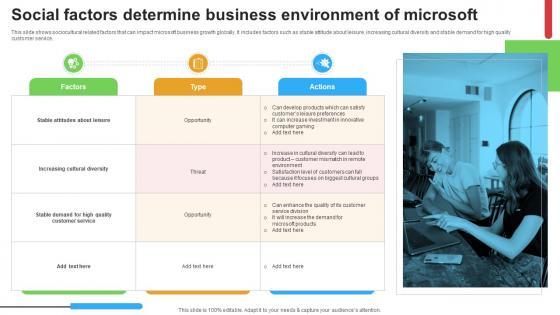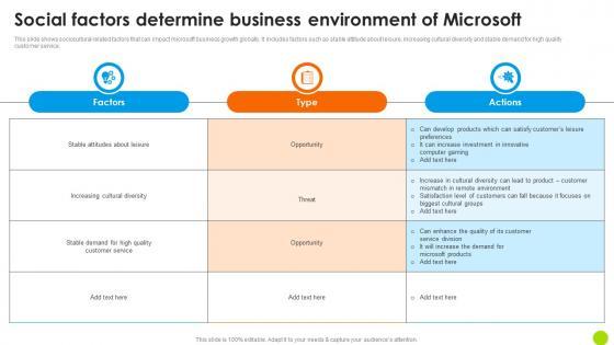 This slide shows sociocultural related factors that can impact Microsoft business growth globally. It includes factors such as stable attitude about leisure, increasing cultural diversity and stable demand for high quality customer service. Get a simple yet stunning designed Social Factors Determine Business Environment Strategic Advancements By Microsofts Slides Pdf. It is the best one to establish the tone in your meetings. It is an excellent way to make your presentations highly effective. So, download this PPT today from Slidegeeks and see the positive impacts. Our easy-to-edit Social Factors Determine Business Environment Strategic Advancements By Microsofts Slides Pdf can be your go-to option for all upcoming conferences and meetings. So, what are you waiting for Grab this template today. This slide shows sociocultural related factors that can impact Microsoft business growth globally. It includes factors such as stable attitude about leisure, increasing cultural diversity and stable demand for high quality customer service.