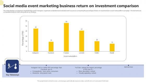 The slide displays a comparison chart that helps event managers organisers understand and evaluate event success by comparing the percentage of return on investment per social media platform campaign. The elements are comparative analysis chart, along with its key findings. Showcasing this set of slides titled Social Media Event Marketing Business Return On Investment Comparison Microsoft Pdf The topics addressed in these templates are Social Media Event, Marketing Business, Investment Comparison All the content presented in this PPT design is completely editable. Download it and make adjustments in color, background, font etc. as per your unique business setting. The slide displays a comparison chart that helps event managers organisers understand and evaluate event success by comparing the percentage of return on investment per social media platform campaign. The elements are comparative analysis chart, along with its key findings.
