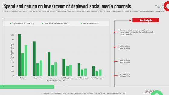 This slide graphically illustrate the spend and ROI performance of deployed social media channels. It also provides the information regarding the number of lead generated from each channel such as Twitter, Facebook, Instagram. Make sure to capture your audiences attention in your business displays with our gratis customizable Social Media Channels Auditing Spend And Return On Investment Of Deployed Social Professional PDF. These are great for business strategies, office conferences, capital raising or task suggestions. If you desire to acquire more customers for your tech business and ensure they stay satisfied, create your own sales presentation with these plain slides.