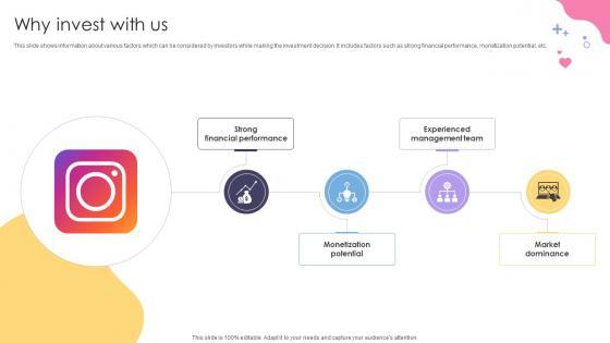 This slide shows information about various factors which can be considered by investors while making the investment decision. It includes factors such as strong financial performance, monetization potential, etc. The best PPT templates are a great way to save time, energy, and resources. Slidegeeks have 100 percent editable powerpoint slides making them incredibly versatile. With these quality presentation templates, you can create a captivating and memorable presentation by combining visually appealing slides and effectively communicating your message. Download Why Invest With Us Social Media Application Development Company Fundraising Pitch Deck from Slidegeeks and deliver a wonderful presentation. This slide shows information about various factors which can be considered by investors while making the investment decision. It includes factors such as strong financial performance, monetization potential, etc.
