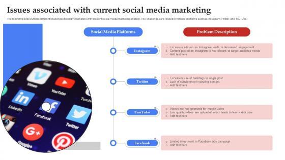 The following slide outlines different challenges faced by marketers with present social media marketing strategy. The challenges are related to various platforms such as Instagram, Twitter, and YouTube. Take your projects to the next level with our ultimate collection of How To Create Cost Effective Issues Associated With Current Social Media Strategy SS V. Slidegeeks has designed a range of layouts that are perfect for representing task or activity duration, keeping track of all your deadlines at a glance. Tailor these designs to your exact needs and give them a truly corporate look with your own brand colors they will make your projects stand out from the rest The following slide outlines different challenges faced by marketers with present social media marketing strategy. The challenges are related to various platforms such as Instagram, Twitter, and YouTube.