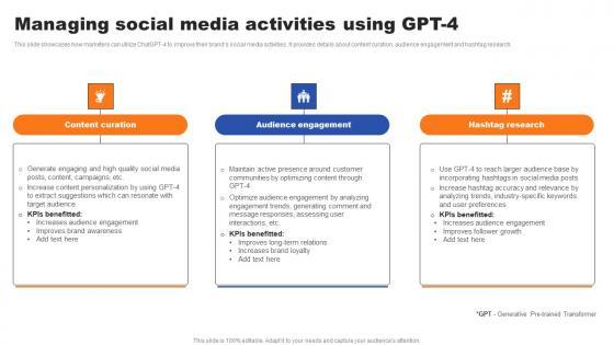 This slide showcases how marketers can utilize ChatGPT-4 to improve their brands social media activities. It provides details about content curation, audience engagement and hashtag research. Coming up with a presentation necessitates that the majority of the effort goes into the content and the message you intend to convey. The visuals of a PowerPoint presentation can only be effective if it supplements and supports the story that is being told. Keeping this in mind our experts created Managing Social Media Activities Using GPT 4 Ppt Layouts Grid PDF to reduce the time that goes into designing the presentation. This way, you can concentrate on the message while our designers take care of providing you with the right template for the situation.