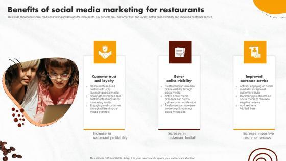 This slide showcases social media marketing advantages for restaurants. Key benefits are customer trust and loyalty, better online visibility and improved customer service. From laying roadmaps to briefing everything in detail, our templates are perfect for you. You can set the stage with your presentation slides. All you have to do is download these easy to edit and customizable templates. Online Promotional Activities Benefits Of Social Media Template Pdf will help you deliver an outstanding performance that everyone would remember and praise you for. Do download this presentation today. This slide showcases social media marketing advantages for restaurants. Key benefits are customer trust and loyalty, better online visibility and improved customer service.