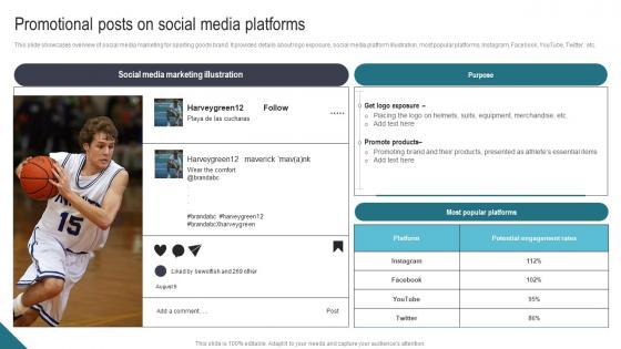This slide showcases overview of social media marketing for sporting goods brand. It provides details about logo exposure, social media platform illustration, most popular platforms, Instagram, Facebook, YouTube, Twitter, etc. Take your projects to the next level with our ultimate collection of Promotional Posts On Social Media Platforms Athletic Activities Advertising Program Structure Pdf. Slidegeeks has designed a range of layouts that are perfect for representing task or activity duration, keeping track of all your deadlines at a glance. Tailor these designs to your exact needs and give them a truly corporate look with your own brand colors they well make your projects stand out from the rest. This slide showcases overview of social media marketing for sporting goods brand. It provides details about logo exposure, social media platform illustration, most popular platforms, Instagram, Facebook, YouTube, Twitter, etc.