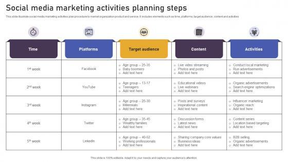 This slide illustrate social media marketing activities plan procedure to market organization product and service. It includes elements such as time, platforms, target audience, content and activities. Showcasing this set of slides titled Social Media Marketing Activities Planning Steps Mockup Pdf. The topics addressed in these templates are Time, Platforms, Target Audience. All the content presented in this PPT design is completely editable. Download it and make adjustments in color, background, font etc. as per your unique business setting. This slide illustrate social media marketing activities plan procedure to market organization product and service. It includes elements such as time, platforms, target audience, content and activities.