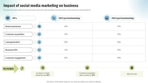 This slide showcases benefits of product promotion using social media marketing on business revenue, brand awareness, lead generation etc. Welcome to our selection of the Project Benchmarking Process Impact Of Social Media Marketing On Business CRP DK SS V. These are designed to help you showcase your creativity and bring your sphere to life. Planning and Innovation are essential for any business that is just starting out. This collection contains the designs that you need for your everyday presentations. All of our PowerPoints are 100Percent editable, so you can customize them to suit your needs. This multi-purpose template can be used in various situations. Grab these presentation templates today. This slide showcases benefits of product promotion using social media marketing on business revenue, brand awareness, lead generation etc.