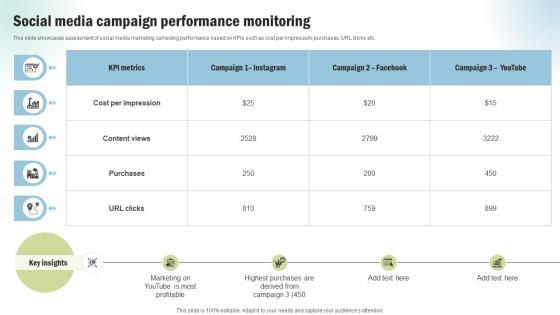 This slide showcases assessment of social media marketing cameoing performance based on KPIs such as cost per impression, purchases, URL clicks etc. There are so many reasons you need a Project Benchmarking Process Social Media Campaign Performance Monitoring CRP DK SS V. The first reason is you can not spend time making everything from scratch, Thus, Slidegeeks has made presentation templates for you too. You can easily download these templates from our website easily. This slide showcases assessment of social media marketing cameoing performance based on KPIs such as cost per impression, purchases, URL clicks etc.