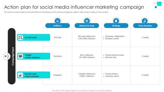 This slide showcases strategic social media influencer marketing plan which includes campaign type, platform, influencer type, strategy and time duration. Slidegeeks is one of the best resources for PowerPoint templates. You can download easily and regulate Marketing Project Performance Benchmarking Action Plan For Social Media CRP SS V for your personal presentations from our wonderful collection. A few clicks is all it takes to discover and get the most relevant and appropriate templates. Use our Templates to add a unique zing and appeal to your presentation and meetings. All the slides are easy to edit and you can use them even for advertisement purposes. This slide showcases strategic social media influencer marketing plan which includes campaign type, platform, influencer type, strategy and time duration.