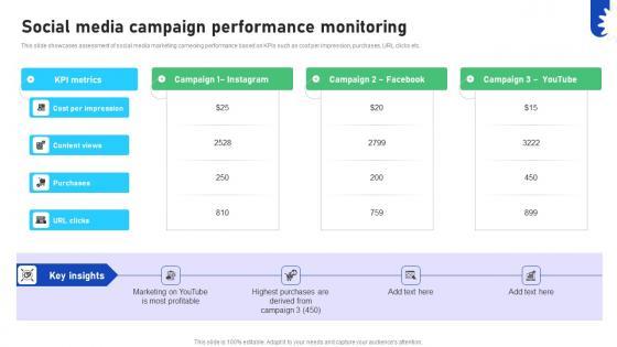 This slide showcases assessment of social media marketing cameoing performance based on KPIs such as cost per impression, purchases, URL clicks etc. There are so many reasons you need a Project Benchmarking Process Social Media Campaign Performance Monitoring CRP DK SS V. The first reason is you can not spend time making everything from scratch, Thus, Slidegeeks has made presentation templates for you too. You can easily download these templates from our website easily. This slide showcases assessment of social media marketing cameoing performance based on KPIs such as cost per impression, purchases, URL clicks etc.