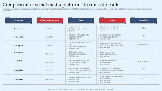 This slide showcases comparative assessment of social media channels which can help marketers to identify ideal platform for running ad campaigns. Its key components are platform, worldwide users, user demographics, B2B and B2C. Are you in need of a template that can accommodate all of your creative concepts This one is crafted professionally and can be altered to fit any style. Use it with Google Slides or PowerPoint. Include striking photographs, symbols, depictions, and other visuals. Fill, move around, or remove text boxes as desired. Test out color palettes and font mixtures. Edit and save your work, or work with colleagues. Download Strategic Performance Marketing Campaign Comparison Of Social Media Platforms To Run Ideas Pdf and observe how to make your presentation outstanding. Give an impeccable presentation to your group and make your presentation unforgettable. This slide showcases comparative assessment of social media channels which can help marketers to identify ideal platform for running ad campaigns. Its key components are platform, worldwide users, user demographics, B2B and B2C.