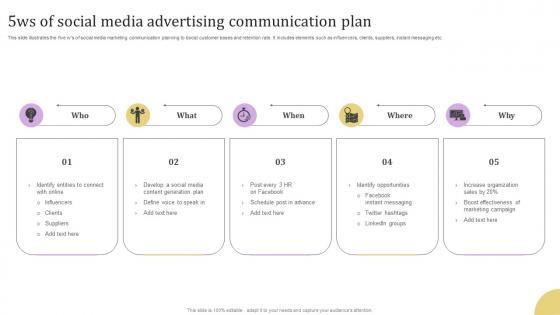 This slide illustrates the five ws of social media marketing communication planning to boost customer bases and retention rate. It includes elements such as influencers, clients, suppliers, instant messaging etc. Pitch your topic with ease and precision using this 5ws Of Social Media Advertising Communication Plan Icon Diagrams Pdf. This layout presents information on Increase Organization, Boost Effectiveness, Marketing Campaign. It is also available for immediate download and adjustment. So, changes can be made in the color, design, graphics or any other component to create a unique layout. This slide illustrates the five ws of social media marketing communication planning to boost customer bases and retention rate. It includes elements such as influencers, clients, suppliers, instant messaging etc.