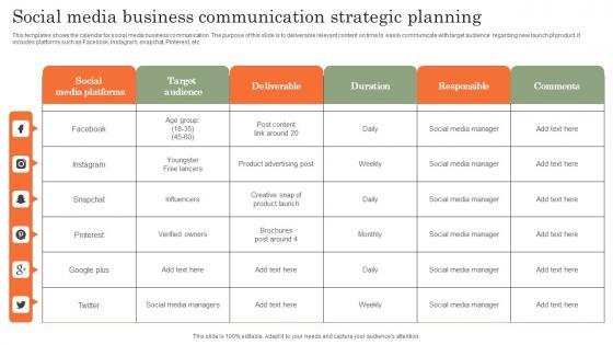 This templates shows the calendar for social media business communication. The purpose of this slide is to deliverable relevant content on time to easily communicate with target audience regarding new launch pf product. It includes platforms such as Facebook, Instagram, snapchat, Pinterest, etc. Pitch your topic with ease and precision using this Social Media Business Communication Strategic Planning Background Pdf. This layout presents information on Media Platforms, Audience, Deliverable. It is also available for immediate download and adjustment. So, changes can be made in the color, design, graphics or any other component to create a unique layout. This templates shows the calendar for social media business communication. The purpose of this slide is to deliverable relevant content on time to easily communicate with target audience regarding new launch pf product. It includes platforms such as Facebook, Instagram, snapchat, Pinterest, etc.