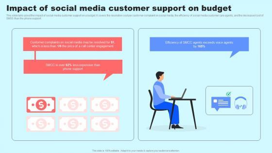 This slide talks about the impact of social media customer support on a budget. It covers the resolution cost per customer complaint on social media, the efficiency of social media customer care agents, and the decreased cost of SMSS than the phone support. If your project calls for a presentation, then Slidegeeks is your go to partner because we have professionally designed, easy to edit templates that are perfect for any presentation. After downloading, you can easily edit Social Media In Customer Support Impact Of Social Media Customer Support On Budget Inspiration Pdf and make the changes accordingly. You can rearrange slides or fill them with different images. Check out all the handy templates This slide talks about the impact of social media customer support on a budget. It covers the resolution cost per customer complaint on social media, the efficiency of social media customer care agents, and the decreased cost of SMSS than the phone support.