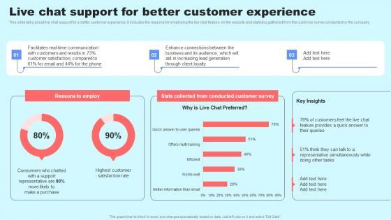 This slide talks about live chat support for a better customer experience. It includes the reasons for employing the live chat feature on the website and statistics gathered from the customer survey conducted by the company. This modern and well arranged Social Media In Customer Support Live Chat Support For Better Customer Experience Inspiration Pdf provides lots of creative possibilities. It is very simple to customize and edit with the Powerpoint Software. Just drag and drop your pictures into the shapes. All facets of this template can be edited with Powerpoint, no extra software is necessary. Add your own material, put your images in the places assigned for them, adjust the colors, and then you can show your slides to the world, with an animated slide included. This slide talks about live chat support for a better customer experience. It includes the reasons for employing the live chat feature on the website and statistics gathered from the customer survey conducted by the company.
