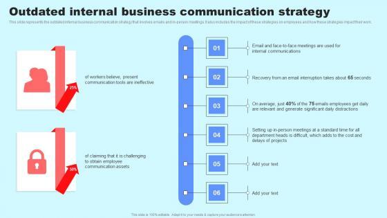 This slide represents the outdated internal business communication strategy that involves emails and in person meetings. It also includes the impact of these strategies on employees and how these strategies impact their work. The Social Media In Customer Support Outdated Internal Business Communication Strategy Clipart Pdf is a compilation of the most recent design trends as a series of slides. It is suitable for any subject or industry presentation, containing attractive visuals and photo spots for businesses to clearly express their messages. This template contains a variety of slides for the user to input data, such as structures to contrast two elements, bullet points, and slides for written information. Slidegeeks is prepared to create an impression. This slide represents the outdated internal business communication strategy that involves emails and in person meetings. It also includes the impact of these strategies on employees and how these strategies impact their work.