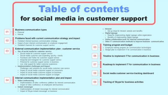 Get a simple yet stunning designed Table Of Contents For Social Media In Customer Support Diagrams Pdf. It is the best one to establish the tone in your meetings. It is an excellent way to make your presentations highly effective. So, download this PPT today from Slidegeeks and see the positive impacts. Our easy to edit Table Of Contents For Social Media In Customer Support Diagrams Pdf can be your go to option for all upcoming conferences and meetings. So, what are you waiting for Grab this template today. Our Table Of Contents For Social Media In Customer Support Diagrams Pdf are topically designed to provide an attractive backdrop to any subject. Use them to look like a presentation pro.