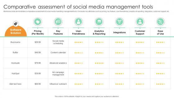 Mentioned slide demonstrates comparative assessment of social media marketing management tools. It includes key attributes such as pricing, key feature, user friendliness, analytics and reporting, integration, customer support, etc.Coming up with a presentation necessitates that the majority of the effort goes into the content and the message you intend to convey. The visuals of a PowerPoint presentation can only be effective if it supplements and supports the story that is being told. Keeping this in mind our experts created Comparative Assessment Of Social Media Management Comprehensive Guide For Marketing Technology to reduce the time that goes into designing the presentation. This way, you can concentrate on the message while our designers take care of providing you with the right template for the situation. Mentioned slide demonstrates comparative assessment of social media marketing management tools. It includes key attributes such as pricing, key feature, user friendliness, analytics and reporting, integration, customer support, etc.